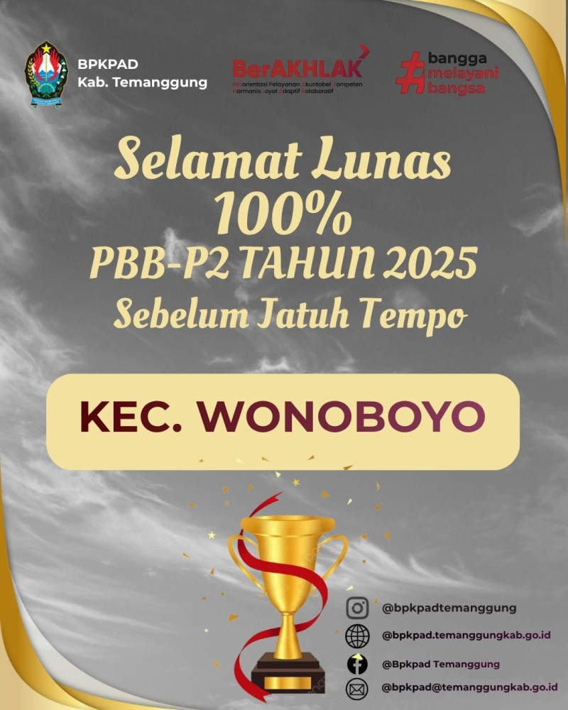 Berita Kategori: Smart Government (Pemerintah Cerdas) Sekretariat Jumat, 07/11/2025 09:00 11 HARI JADI KABUPATEN TEMANGGUNG Selengkapnya Kategori: Smart Government (Pemerintah Cerdas) Sekretariat Minggu, 02/11/2025 09:59 10 HARI JADI KABUPATEN TEMANGGUNG Selengkapnya Kategori: Smart Government (Pemerintah Cerdas) Sekretariat Minggu, 02/11/2025 09:00 9 HARI JADI KABUPATEN TEMANGGUNG Selengkapnya Kategori: Smart Government (Pemerintah Cerdas) Sekretariat Sabtu, 01/11/2025 09:00 9 emanggung Government Autoshow 2025 Selengkapnya Kategori: Smart Government (Pemerintah Cerdas) Sekretariat Sabtu, 01/11/2025 09:00 10 Goverment Auto Show (GAS) 2025 SEBAGAI UPAYA PENINGKATA PAD Selengkapnya Kategori: Smart Government (Pemerintah Cerdas) Sekretariat Jumat, 31/10/2025 18:00 31 Ucapan Terima Kasih dan Apresiasi Selengkapnya Kategori: Smart Government (Pemerintah Cerdas) Sekretariat Jumat, 31/10/2025 09:00 57 Selamat & Sukses! Selengkapnya Kategori: Smart Government (Pemerintah Cerdas) Sekretariat Jumat, 31/10/2025 09:00 21 Ucapan Terima Kasih dan Apresiasi Selengkapnya Kategori: Smart Government (Pemerintah Cerdas) Sekretariat Jumat, 31/10/2025 09:00 27 Ucapan Terima Kasih dan Apresiasi Selengkapnya Kategori: Smart Government (Pemerintah Cerdas) Sekretariat Jumat, 31/10/2025 08:00 30 Ucapan Terima Kasih dan Apresiasi Selengkapnya Kategori: Smart Government (Pemerintah Cerdas) Sekretariat Rabu, 29/10/2025 09:00 17 APEL PAGI BPKPAD DIPIMPIN OLEH PJ SEKDA TEMANGGUNG Selengkapnya Kategori: Smart Government (Pemerintah Cerdas) Bidang Perencanaan dan Penetapan Pendapatan Rabu, 29/10/2025 08:00 40 AYO BAYAR PBB P2 Selengkapnya Prev12345NextLast